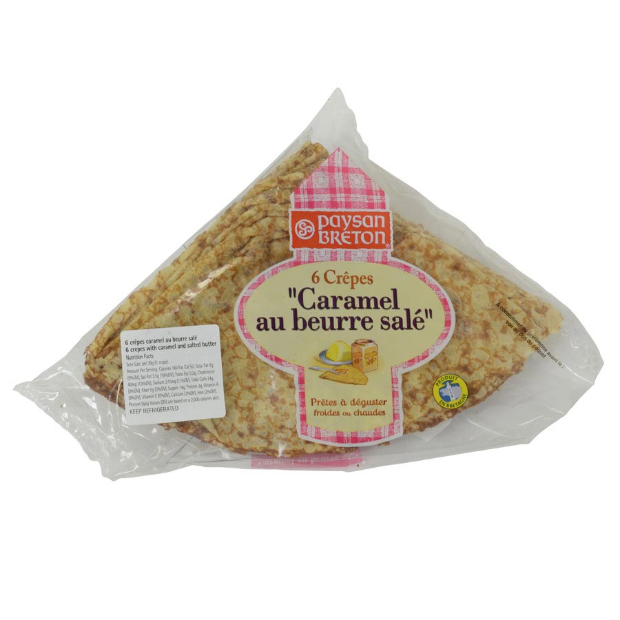 Caramel CrepesThe traditional crepe is a staple in France, where it's eaten anywhere from street carts to 5-star restaurants, bursting with sweet and savory fillings. Le Paysan Breton's salted caramel ready made crepes are the perfect blend of sweet and salty, with a mouthwatering butter and caramel flavor that's perfect to pair with ice cream, fruits, cream, Nutella or just your favorite sweet filling.Ingredients: Wheat flour, fresh pasteurized milk, eggs, sugar, salted butter caramel (18% glucose syrup, sugar, cream salted butter (21%)), fresh butter, dextrose, concentrated butter, salt.Storage: refrigeratedAvailability: Usually ships within 1 business days. Product is perishable and must ship via Overnight service. Sweets Selection: CrepesBrands: Paysan BretonOrigin: France