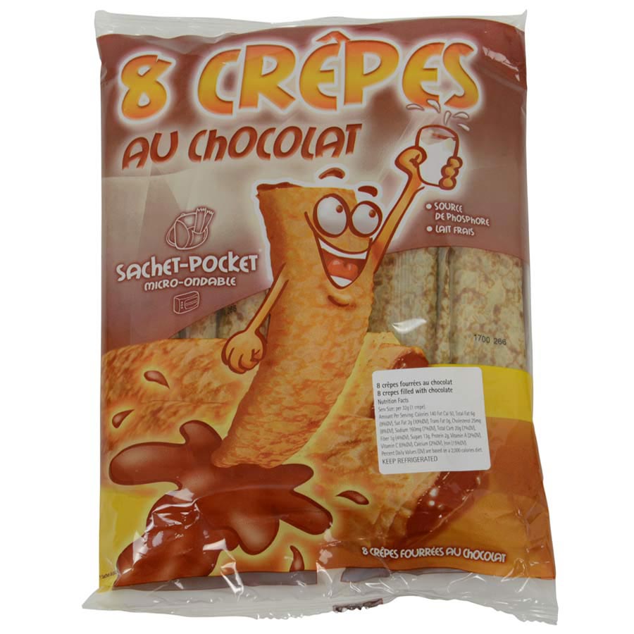 Ingredients: Crepes (60%): wheat flour, pasteurized fresh milk (29%), eggs, sugar, fresh butter (7%), dextrose, salt. Filled with Chocolate (40%): sugar, vegetable fat (sunflower), chocolate (10%) (low-fat powder cocoa, cocoa paste, sugar), low-fat powder cocoa, hazelnuts paste, skimmed powder milk, lactose, emulsifier: lecithin of soya, flavors.