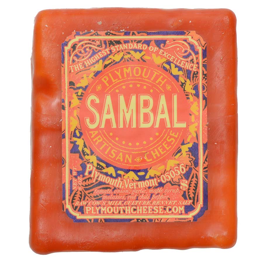 The ideal union of familiar and exotic, the zesty chili-based condiment popular in South-East Asian cuisine feels at home paired with the bold taste of cheddar cheese. The base of this cheese is Plymouth's signature raw cow's milk cheddar, known for its creamy texture and rich, nutty flavor. The addition of house-made Sambal introduces a tantalizing heat that elevates the cheese to a new level.