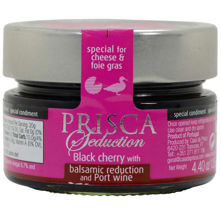 Black Cherry Spread with Balsamic and Port WineSucculent cherries are blended with rich balsamic vinegar and sweet port wine in this amazing preserve by Prisca. It was created to enhance and complement cheeses and foie gras, but it's also fabulous when used as a marinade or glaze, or paired with salami and chorizo on a meat platter. Also try it on pastries like scones or biscuits for a sweet-savory twist.Ingredients: Black cherry 53.3%, sugar, balsamic vinegar 6.7% and port wine 6.7%Availability: Usually ships within 1 business days. Product is non-perishable and can ship via Ground service. Types of Condiments: Jellies and Compotes, Spreads and TapenadesBrand: PriscaOrigin: Portugal
