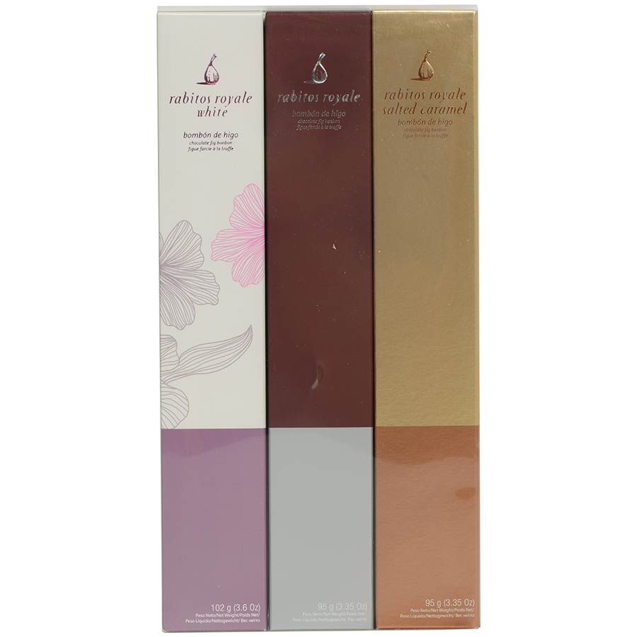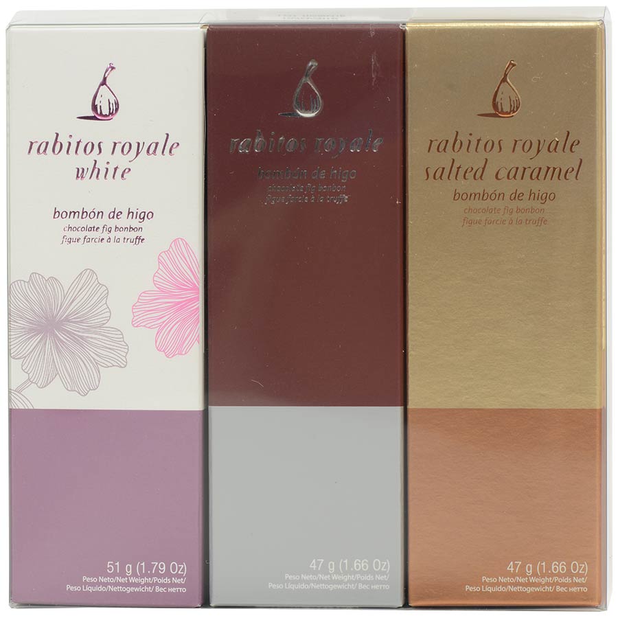 Discover the delicious flavor of sweet baby figs from Extremadura in this delightful sampler of Rabitos Royale's signature chococolate-covered fig confections. This trio includes the original Rabitos, made with tender and juicy Almoharin figs filled with chocolate truffle cream, then hand-dipped in fine chocolate for the perfect thin couverture, and two of their most popular variations - White Chocolate Rabitos (made with a touch of strawberry in their filling, yum!), and Caramel, one of our favorite treats. Caramel Rabitos are crated with a touch of salty-sweet caramel in the filling, all perfectly enrobed in milk chocolate.