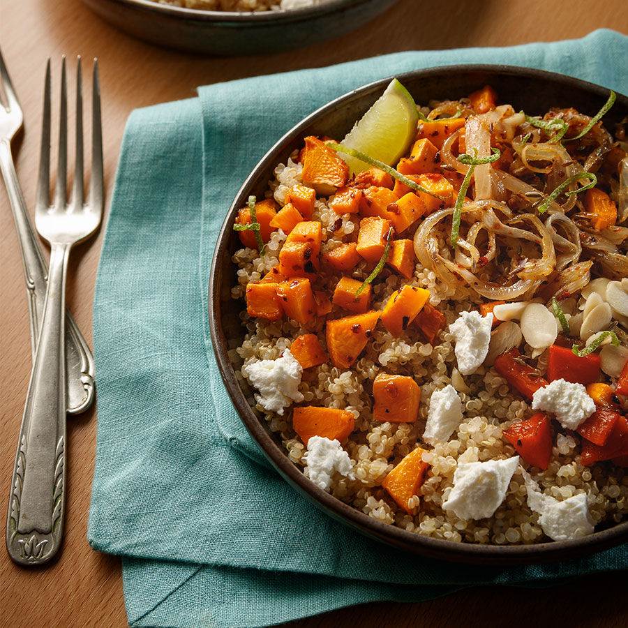 Roasted Squash Quinoa Bowl RecipeIngredients3 1/2 oz. quinoavegetable broth (double the amount of quinoa)2 cups butternut squash, cubed small4 tbsp olive oil1 onion, julienned2 garlic cloves,minced1 tsp. cumin seeds1 tbsp ginger powder½ tsp turmeric powder¼ tsp chili powder2 garlic cloves, mincedSalt and pepper, to tasteZest and juice of 1 lime½ cup sliced almonds1 red bell pepper cooked and peeled1 piece crottin cheese1 lime cut in wedgesDirectionsRinse the quinoa under cold running water, then place in a pan covered with broth, over medium heat until boiling. Simmer for 10-15 minutes, until liquid is absorbed and quinoa is tender. Fluff with a fork, reserve warm.Heat oven to 350°F.In a large bowl, toss the squash or pumpkin with 1 tbsp olive oil, the chili powder, salt and black pepper. Place in an baking tray and bake about 30 minutes, stirring once, until tender and golden. Reserve warm.Sautee the onion and the garlic in a pan with 1 tbsp olive oil until tender, then add the cumin seeds, ginger powder, turmeric powder, chili powder, salt and black pepper. Sautee one more minute and reserve. Cook for 1 minute and set asideDivide the cooked quinoa in 4 bowls, cover with the pumpkin, the red bell pepper cut in cubes, the onion mixture, the almonds and the goat cheese cut in small pieces.For the dressing, whisk 2 tbsp olive oil and the zest and lemon juice, drizzle over the quinoa bowls or serve on the side.This recipe is found in:Recipes by Course or Meal: Appetizers and Side Dishes, Main CoursesRecipes by Occasion: Thanksgiving RecipesRecipes by Cuisine: American Recipes Recipes by Season: Fall Recipes