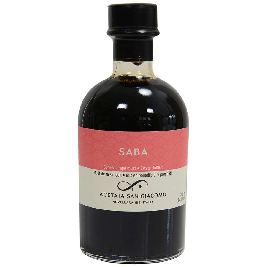 Saba or Mosto Cotto as it’s also called, means “cooked grape juice” and is made from sweet unfermented grape must, that has been cooked down until it reaches a syrupy consistency. Must is freshly squeezed grape juice still containing the seeds, skins, and stems of the fruit. Specifically made from one particular variety of grapes, to be real Saba, it must be procured from the Trebbiano grape. An unconcentrated pre-balsamic, it offers a sweet caramelized flavor to recipes.