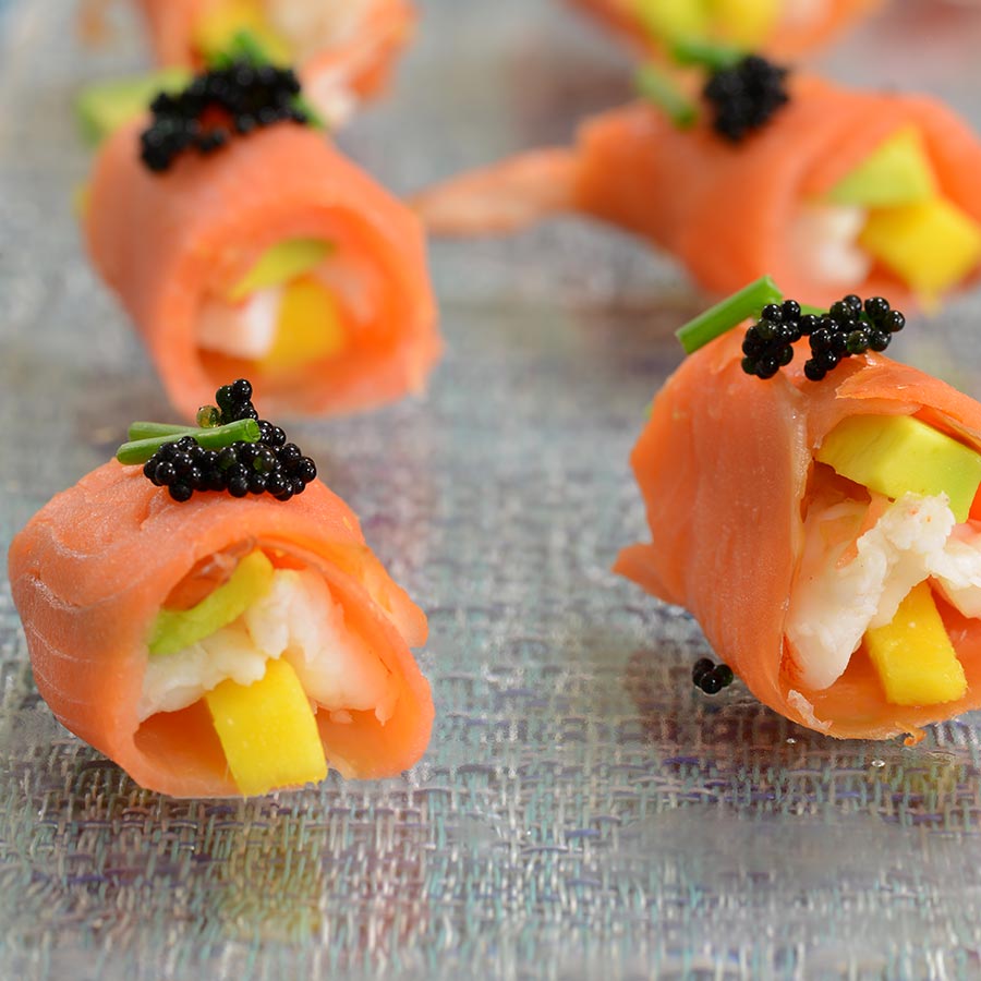 Impress your guest with your sushi-making skills with our incredible smoked salmon sushi roll. Made with slices of buttery smoked salmon, rolled up with sweet mango, avocado and topped with black caviar, this smoked salmon appetizer is simple to make, delicious and looks beautiful when served.