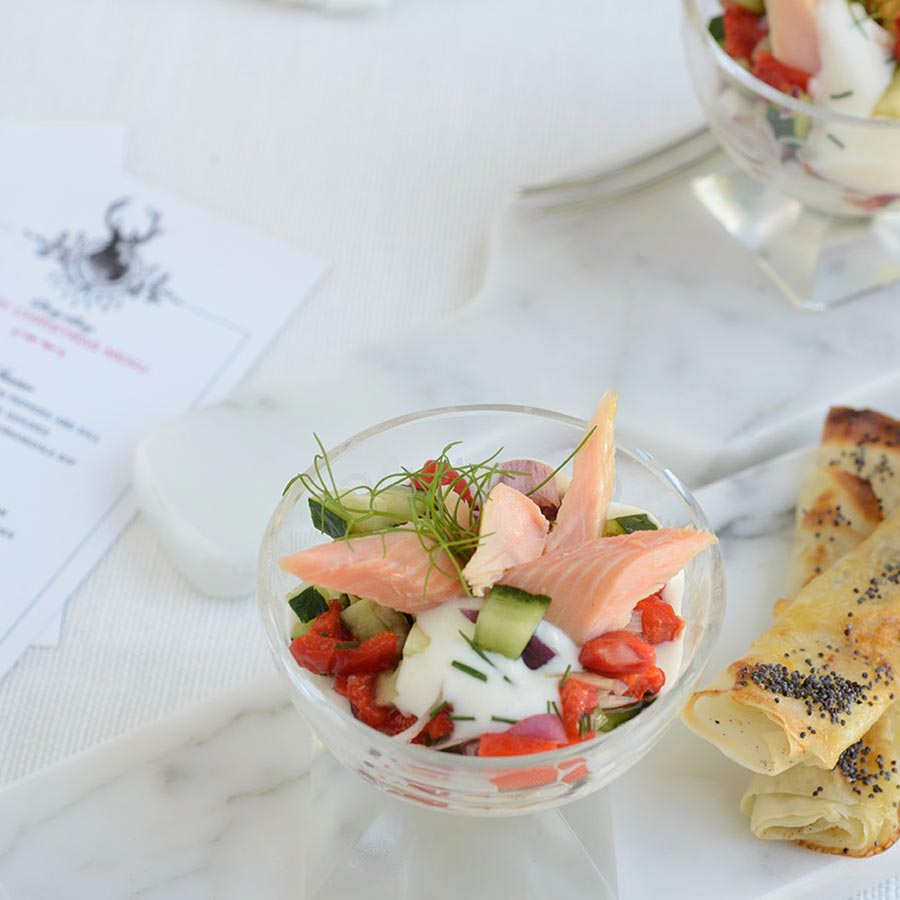 Smoked Trout Appetizers RecipeIngredients5 washed red peppers1 large cucumber diced1 medium red onion peeled and finely chopped4 tbsp. lemon juice3 tsp. Dijon mustard14 oz. smoked trout7 oz. crème fraiche1 tbsp. fresh dill chopped8 small pieces of dill leaves8 dessert glassesDirectionsHeat the oven to 350°F.Arrange the whole red peppers in a large roasting pan. Bake at 350 for 45 minutes, until they’re golden, turning over once. Remove and allow to cool down.Remove the skin and seeds, and cube. In a large bowl, mix with the cucumber, onion, and 2 tablespoons of lemon juice and reserve.Cut the smoked trout into small pieces.Place 1 tsp. of mustard at the bottom of each glass, then layer with the red pepper mix and arrange a few pieces of smoked trout. Drizzle the remaining lemon juice over each glass.Mix the crème fraiche with the chopped dill, and finish each class with a dollop, and garnish with sprigs of dill.This recipe is found in:Recipes by Ingredient: Seafood RecipesRecipes by Course or Meal: Appetizers and Side Dishes, Breakfast and Brunch RecipesRecipes by Occasion: Easter Recipes, Labor Day and 4th of July Recipes, Thanksgiving RecipesRecipes by Cuisine: American Recipes Recipes by Season: Spring and Summer Recipes, Fall Recipes