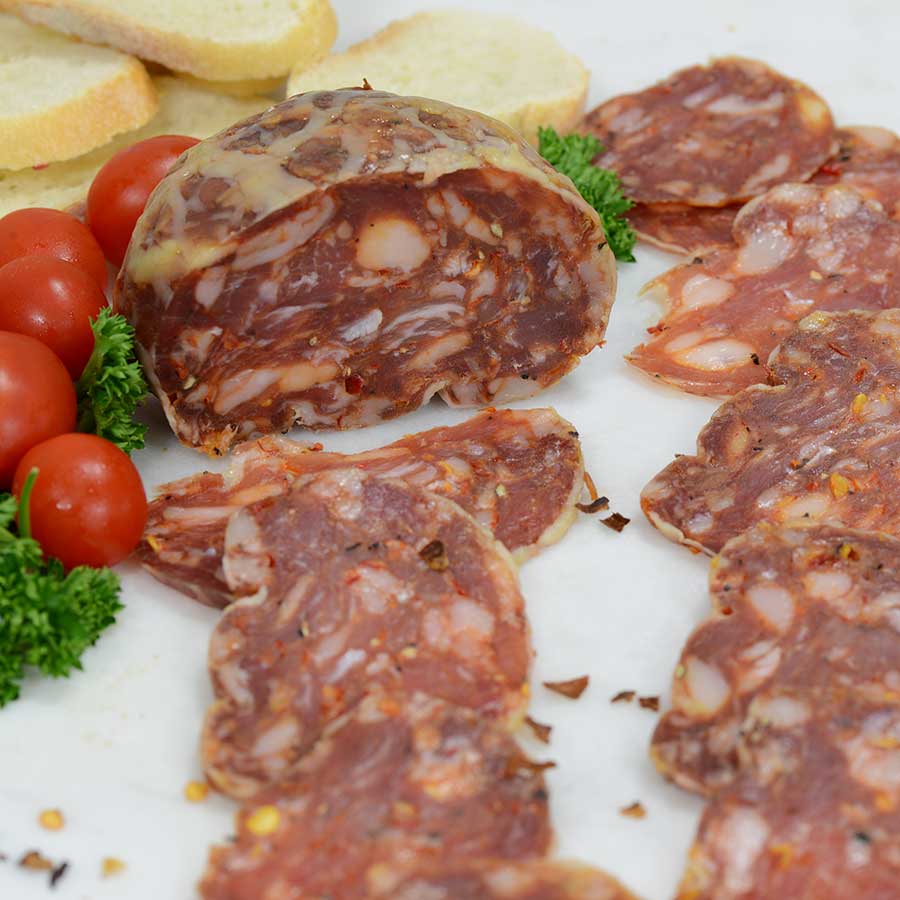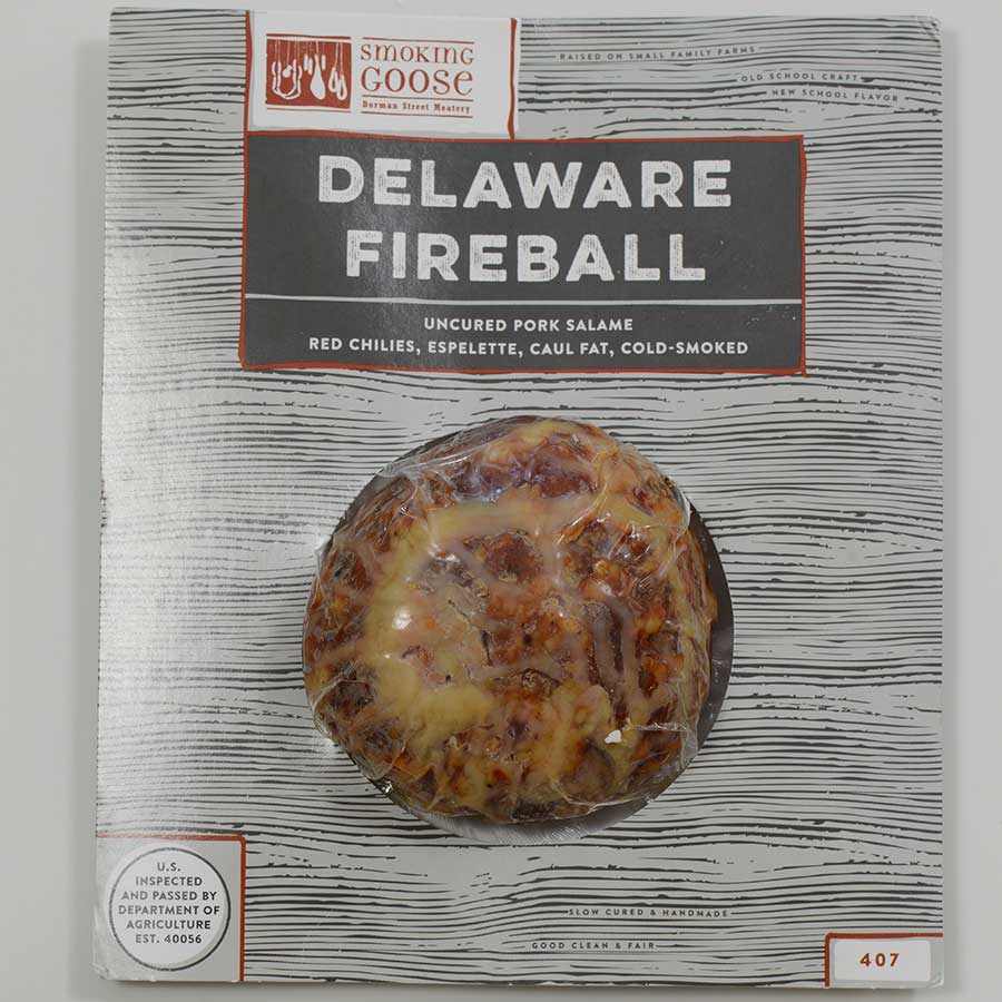 Delaware Fireball Ingredients: Pork, sea salt, spices (garlic, crushed red pepper, black pepper, paprika, espelette pepper, cayenne pepper), dextrose, water, vegetable powder (celery juice, sea salt), lactic acid starter cultures, caul fat.Availability: Usually ships within 1 business days. Product is non-perishable and can ship via Ground service. Smoked/Cured Meats: Salami and Dry SausageOrigin: United States