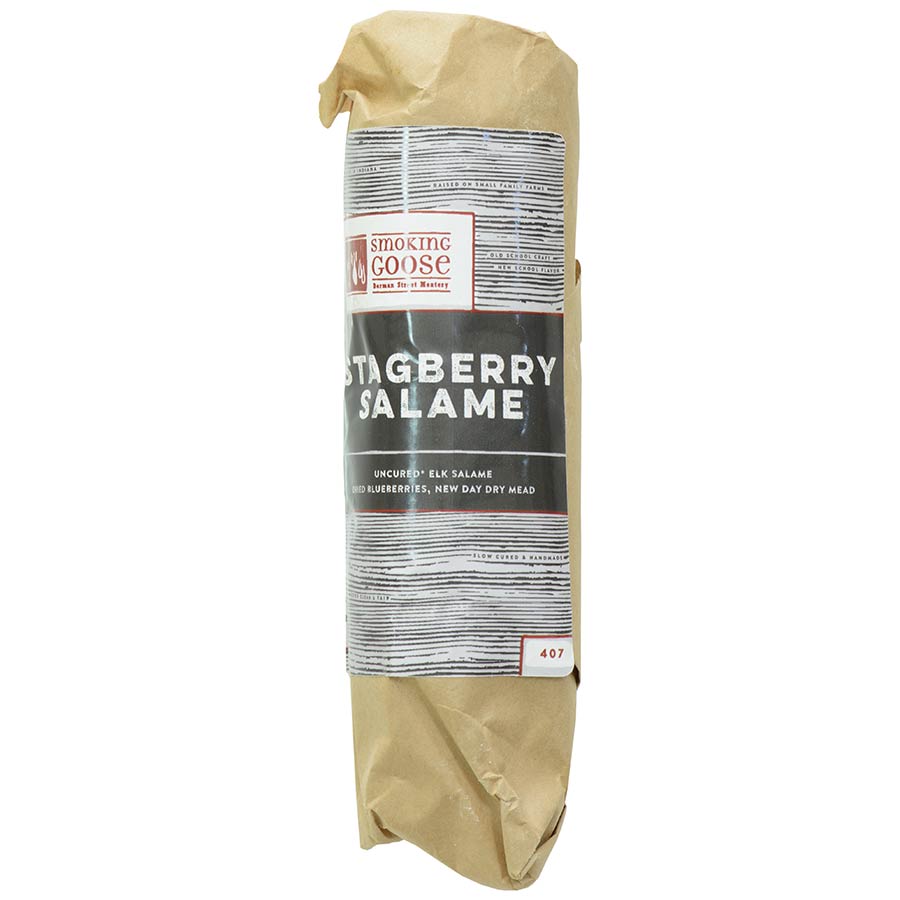 Stagberry Salame Ingredients: Elk shoulder, pork shoulder, pork fat, dry mead (honey wine), spices (sea salt, dried blueberries, garlic, dextrose, black pepper, honey), water, vegetable powder (celery juice, sea salt), lactic acid starter culture, natural beef casings.Availability: Usually ships within 1 business days. Product is perishable and must ship via Overnight service.