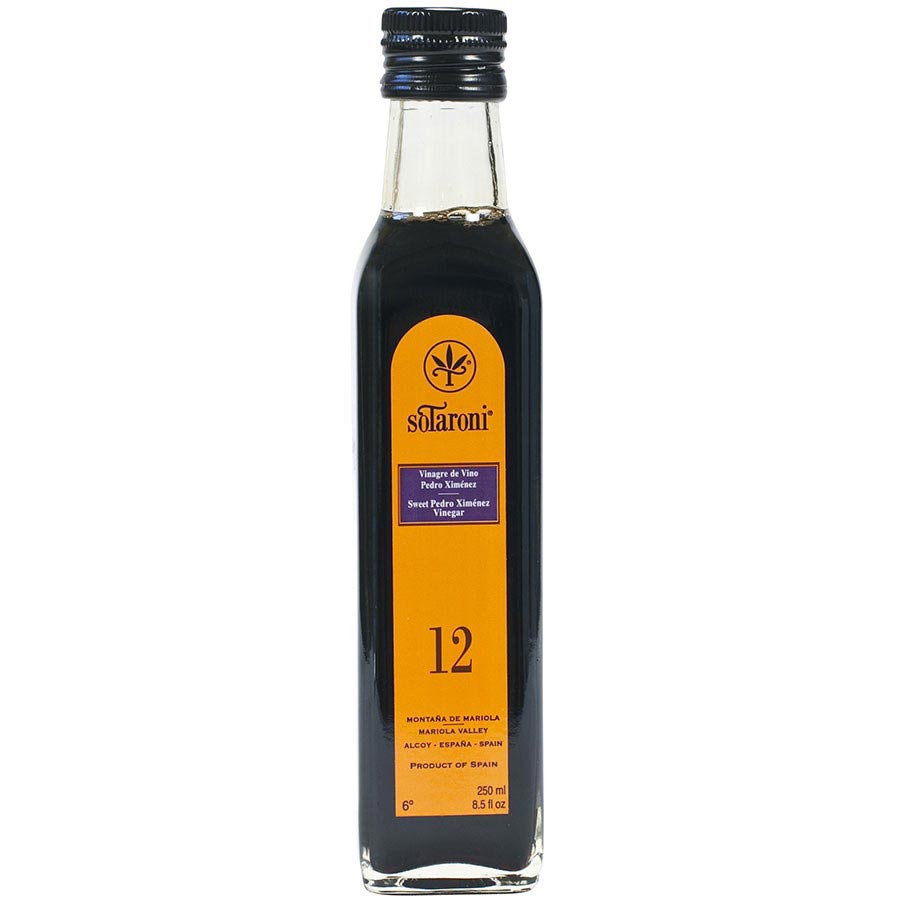 Sweet Pedro Ximenez Balsamic Vinegar - 12 Years AgedA very unique Spanish vinegar, Pedro Ximenez Balsamic Vinegar is made from the Pedro Ximenez variety of white grape. Also used to distill a delicious Sherry, this Sweet Pedro Ximenez Balsamic Vinegar is aged for 12 years in antique oak American barrels. The result is a thick, dark, sweet vinegar, very aromatic with hints of nuts and figs. Use in salads, drizzled over strawberries, or to season dark meats. Sotaroni produces their amazing gourmet oils and vinegars in their gorgeous TorreVella estate, on the coast of Spain.Ingredients: wine vinegar, must concentrates, antioxidant E-220 and coloring E-150aAvailability: Usually ships within 1 business days. Product is non-perishable and can ship via Ground service. Type: AgedOrigin: Spanish