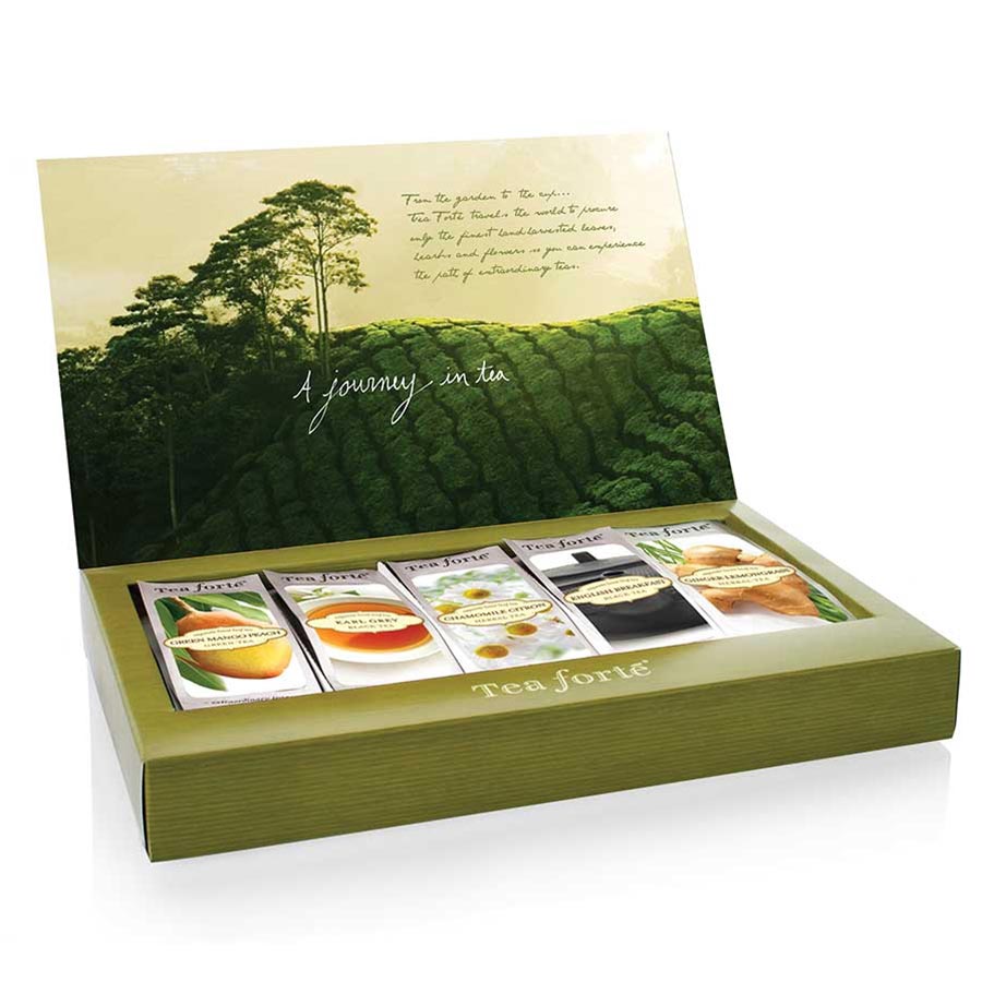 Tea Forte Classic Sampler Loose Leaf Tea Single SteepsTea Forte Classic Sampler Loose Leaf Tea Single Steeps makes it easy to brew the perfect pot of tea. Simply open one of pre-portioned pouches and pour its contents into your teapot or infusing basket. Then pour hot water over the leaves to brew a wonderful 12-ounce cup or pot of tea. Passionate tea-sippers can now brew the perfect cup anytime, anyplace. Each box contains 15 Single Steep pouches, 3 for each of these blends: Green Mango Peach: a tropical-sweet blend of superior Chinese green tea, juicy fruits and peppermint. Earl Grey: Indian Assam black tea, Italian bergamot and cornflower blossoms create a bold, citrusy classic. Chamomile Citron: a fragrant blend of chamomile blossoms sweetened with licorice, lemongrass and mint. English Breakfast: rich and robust Assam morning tea with malty flavor and hints of raisin Ginger Lemongrass: a complex harmony of ginger, lemongrass and spearmint, for a soothing, sunny cup. Buy tea online from Gourmet Food Store to enjoy exquisite tea delivered securely to your door.Ingredients: Green Mango Peach: Organic green tea, organic peppermint leaves, organic green honeyblush, natural flavors, organic mango cubes, organic ginger root, organic peach pieces. Earl Grey: Organic Indian assam black tea, natural bergamot flavor, natural orange flavor, organic cornflower petals. Chamomile Citron: Organic chamomile flowers, organic lemon verbena, organic rosehip shells, organic lemon peel, organic lemon oil, organic peppermint leaves, organic lemongrass, organic hibiscus, organic licorice root, natural flavors. English Breakfast: Organic Indian assam black tea. Ginger Lemongrass: Organic ginger root, organic licorice root, organic spearmint leaves, organic lemongrass, organic lemon peel. Availability: Usually ships within 1 business days. Product is non-perishable and can ship via Ground service.