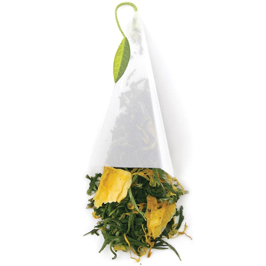 Tea Forte Green Mango Peach Green Tea is a sunny, golden-green infusion, bringing together superior quality Chinese tea with a range of tropical ingredients. The sweet nectar of mango cubes and orchard-picked peach add a fruity dimension to the green tea base, while organic ginger root brings a gentle hint of spice. Finally, the lance-shaped leaves of organic peppermint lend a fantastically fresh aftertaste to the end of each sip. Perfectly balanced with an assiduous attention to taste and aroma, Green Mango Peach is a vital and revitalizing addition to your collection of teas.