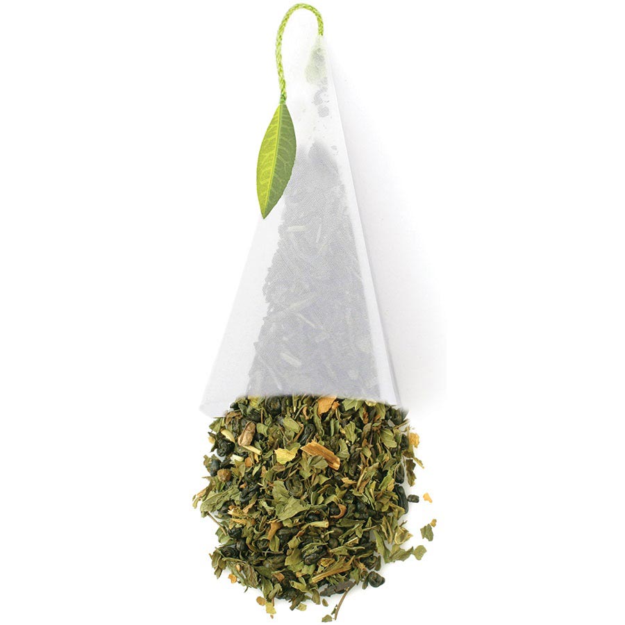 Moroccan Green is presented in boxes of 6 or 48 silken infusers. Each specially crafted teabag is designed to unfurl the tealeaves and release flavors into the water during the steeping process. They’re made from gluten-free, recyclable fibers, and have a refined, pyramid-like shape suggestive of the exotic and sophisticated tea hidden within.