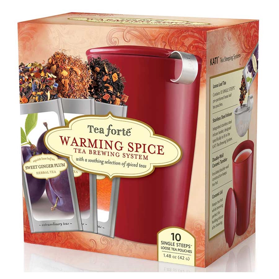 Our Tea Forte Tea Brewing System has everything you need to start steeping delicious, spicy teas. Included is an innovative KATI cup with stainless steel infuser, double-ceramic walls and ceramic lid, allowing you to steep tea with ease. Also included are 10 Single Steep pouches, each of which contains the optimum serving of one cup of tea. Simply pour the tea leaves into the infuser basket, pour water on top, and steep away. 2 pouches for each of the following blends: