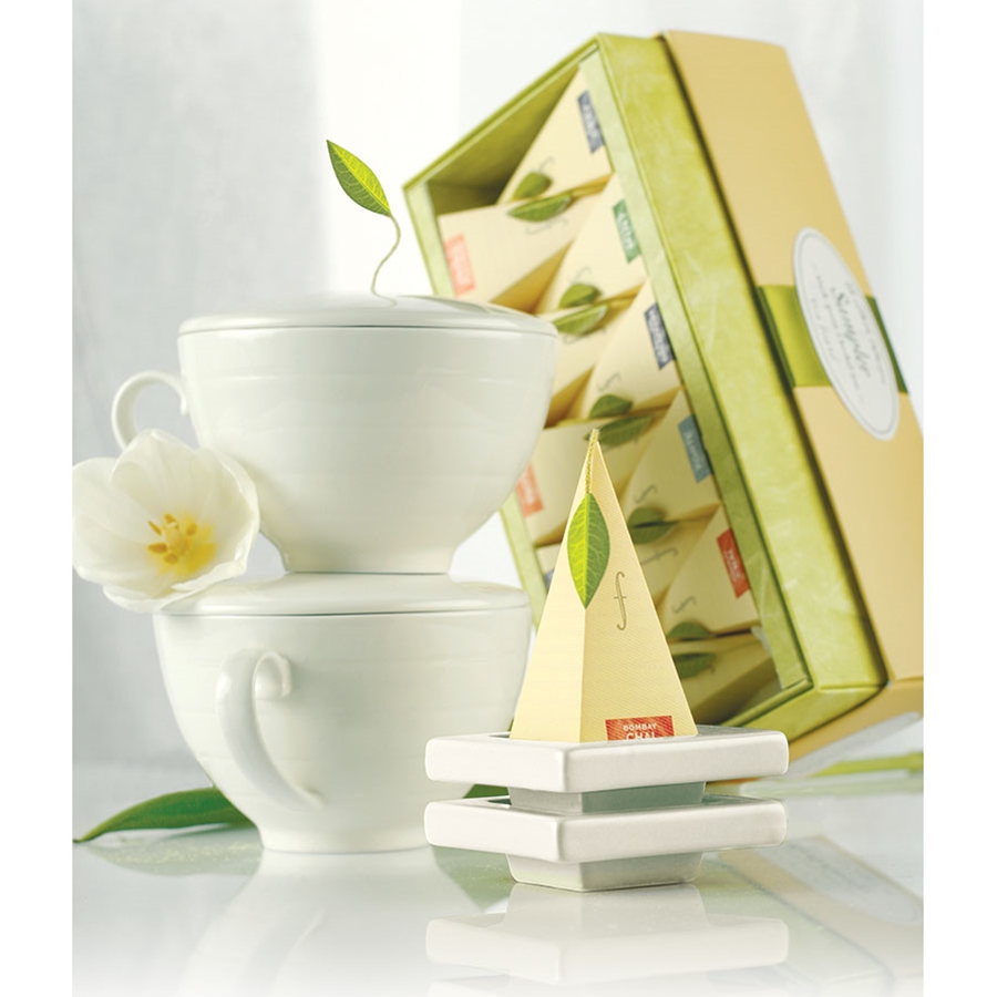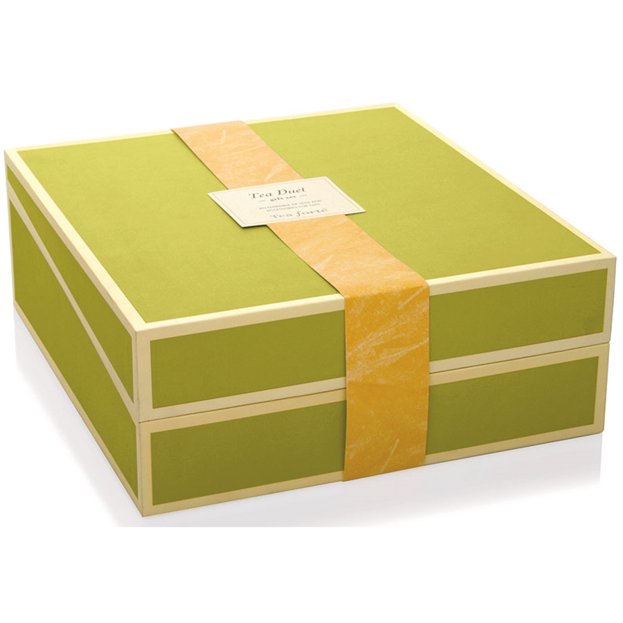 Tea Forte Tea Duet Gift Set Box Tea Forte Tea Duet Gift Set Box contains everything you need to prepare an elegant tea for two. The included Tea Forte Ribbon Box Sampler has ten delicious blends to choose from, in silken infusers that are food-safe and environmentally friendly. Meanwhile, 2 porcelain 10-ounce cups and 2 white ceramic tea trays deliver sumptuous presentation. This tea gift set box comes in a lovely green box with cream piping and internal ribbon. Gift box measures W10.5" x H10" x D4" This Tea Forte gift set was created by the ultimate ambassadors of the tea-drinking experience. They present a diverse range of handcrafted teas and utensils with beautifully decorated packaging, enjoyed in the most prestigious restaurants, hotels, resorts and luxury retailers across the globe. Buy tea online from Gourmet Food Store for efficient delivery to your door in secure packaging.Ingredients: Tea cups: porcelain. Tea trays: ceramic.Availability: Usually ships within 1 business days. Product is non-perishable and can ship via Ground service.