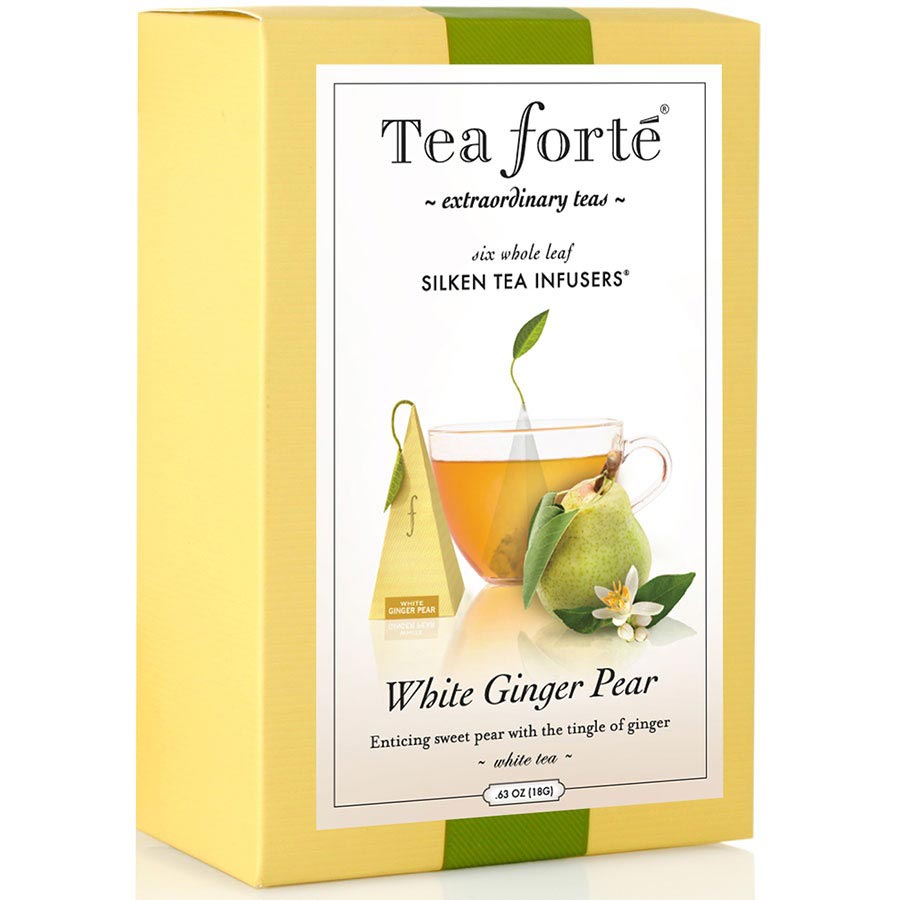 White Ginger Pear Tea is a creation of Tea Forté. Starting out in Massachusetts in 2003, the company began with a highly stylized product line based on traditional Japanese tea drinking ceremonies, intended to “elevate a cup of tea into an extraordinary experience for all your senses.” Today, they present an unparalleled variety of handcrafted teas and tea accessories with sumptuously decorated packaging. Enjoyed in over 35 countries, their products can be found in the most prestigious restaurants, hotels, resorts and luxury retailers, making them ultimate ambassadors of the tea-drinking experience.