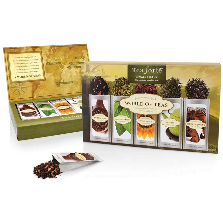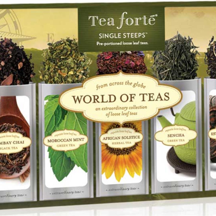 Tea Forte World Of Teas Sampler Loose Leaf Tea Single SteepsTea Forte World Of Teas Sampler Loose Leaf Tea Single Steeps makes brewing tea a breeze. Empty the contents of each pre-portioned pouch into your teapot or infusing basket, and pour water over the leaves to brew the perfect 12-ounce cup or pot of tea. Now passionate tea-sippers can steep the perfect cup anytime, in any place. One box contains 15 Single Steep pouches, 3 for each of these blends: Bombay Chai: ebony-colored black tea with spicy notes of cinnamon and cloves, and hints of tropical coconut. Moroccan Mint: Moroccan Nana leaves combined with Chinese gunpowder green tea for sweet, refreshing brew. African Solstice: smooth South African rooibos layered with sun-ripened berries, Chilean rosehips and rose petals. Sencha: superior grade Sencha green tea dried and steamed in traditional Japanese style. Estate Darjeeling: Himalayan black tea with a pleasantly astringent, floral and nutty taste. Buy tea online from Gourmet Food Store to enjoy the finest tea delivered secure to your door.Ingredients: Bombay Chai: Organic black tea, organic ginger, organic cinnamon, organic cardamom, natural flavors, organic cloves, organic star anise, organic black pepper. Moroccan Mint: Organic green tea, organic spearmint leaves. African Solstice: Organic rooibos, organic rose hips, organic blueberries, organic elderberry, natural flavors, organic rose petals. Sencha: Organic green tea. Estate Darjeeling: Organic black tea.Availability: Usually ships within 1 business days. Product is non-perishable and can ship via Ground service.