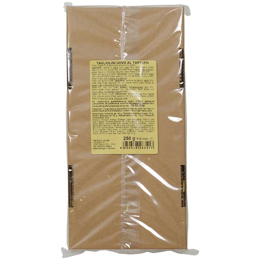 Ingredients: Durum wheat semolina, eggs 23%, summer truffle (Tuber aestivum Vitt.) 2%, flavoring.