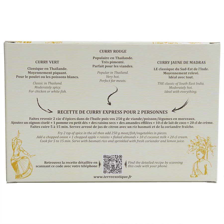 It’s never been easier to make delicious curries than with this spice set from Terre Exotique! Each box contains three tins of spices: each with its own distinct blend. A delightful combination of curries; you’ll receive India’s all-purpose Madras curry, along with Thailand's green and red curries.