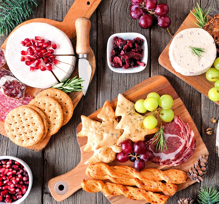For your Thanksgiving board, choose cheeses that reflect the essence of the season. Start with rich and creamy selections like Brie, Camembert, or a triple-cream cheese. These choices echo the comfort and warmth of a Thanksgiving feast. Build up with classic firm cheeses like Comte or Swiss Gruyere, mild and flavorful at the same time. A chevre and a blue cheese adds contrast, and is perfect for more adventurous foodie crowds. Aim for 4 cheeses, so as not to overwhelm the palate.