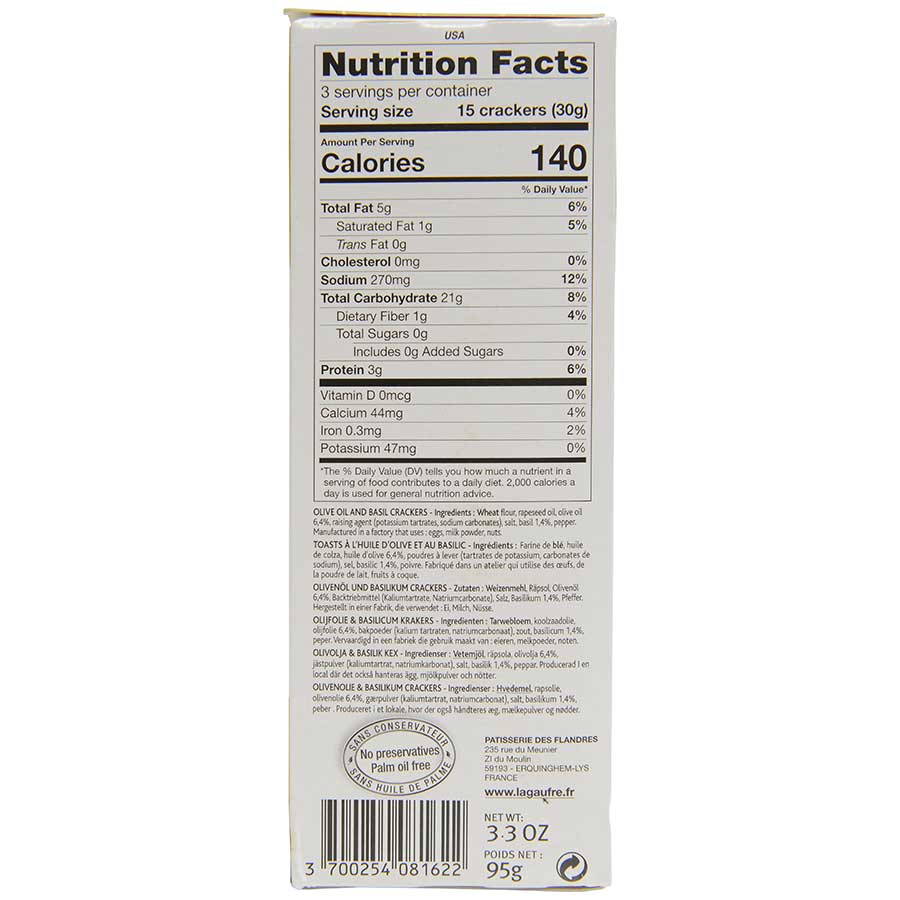 Ingredients: Wheat flour, rapeseed oil, olive oil 6.4%, raising agent (potassium tartrates, sodium carbonates), salt, basil 1.4%, pepper.