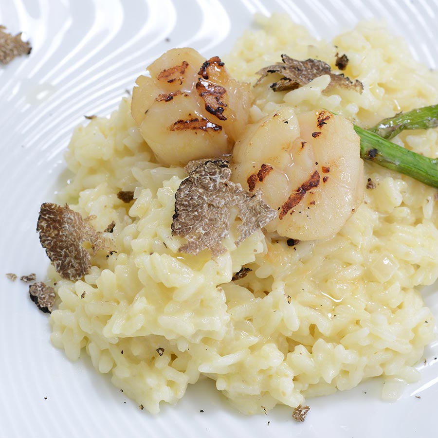 Truffle Risotto With Sauteed Scallops RecipeIngredients2 cup of Arborio rice½ small onion, chopped½ cup grated truffle cheese½ cup grated Parmigiano Reggiano2 tbsp. truffle butter4 cups chicken stock1 cup heavy creamTruffle oilTruffle salt and grated fresh black truffle to garnish20 scallops2 tbsp. olive oilDirectionsMelt butter in a medium pan over medium heat. Add onions and saute for about 2-3 minutes until they get a little soft. Add the Arborio rice and mix with the onions, cooking for 1-2 minutes.Add all the chicken stock and heavy cream and mix. Cook, stirring with a wooden spoon, until it starts thickening.Turn off the fire and stir in the butter and grated cheese. Add the truffle oil and stir.When the risotto is almost done, add the Parmigiano cheese and the fresh truffle.Heat 2 tbsp. olive oil in a skillet over medium-high heat. Place the scallops with 1 inch of space in between. Saute for 1-2 minutes, then flip and cook for another 2 minutes, until sides are opaque and scallops are browned on each side.Plate the risotto, drizzle with truffle oil, add 4 or 5 scallops on top and a few slices of fresh black truffle.This recipe is found in:Recipes by Ingredient: Seafood Recipes, Truffle RecipesRecipes by Course or Meal: Main CoursesRecipes by Occasion: Thanksgiving Recipes, Holiday RecipesRecipes by Cuisine: Italian RecipesRecipes by Season: Fall Recipes, Winter Recipes