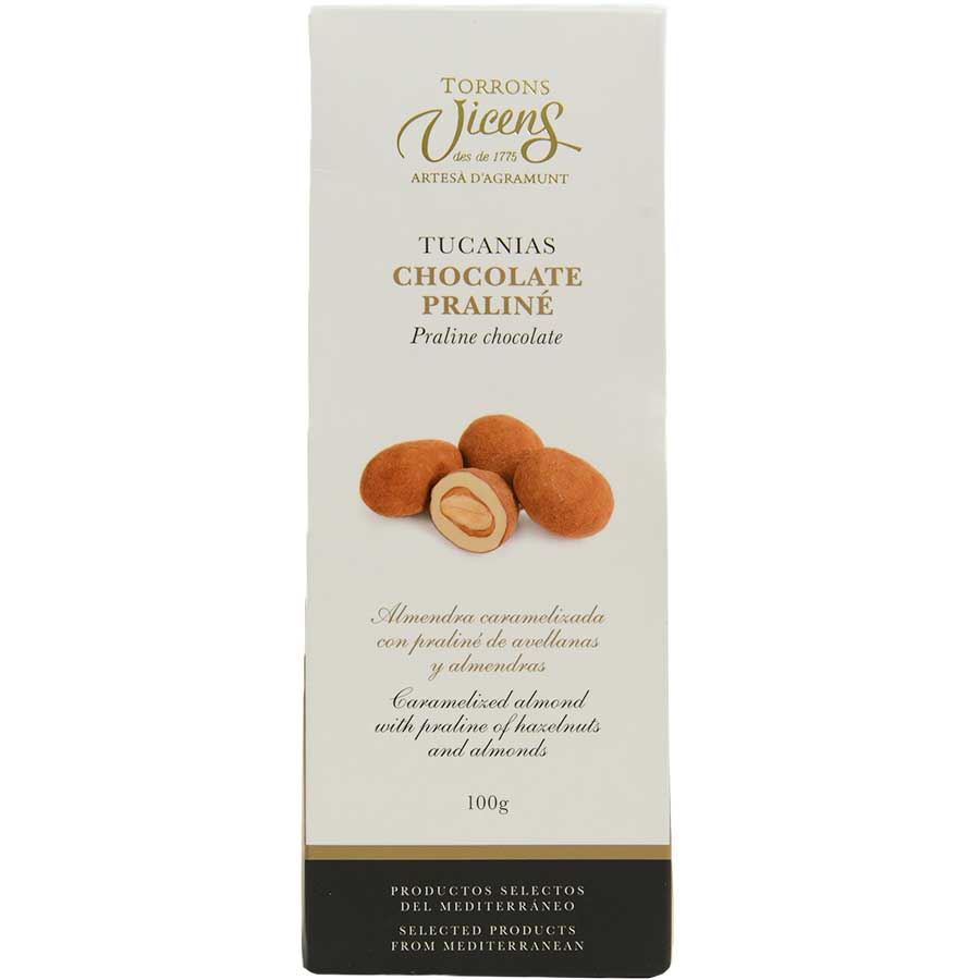 Caramelized almonds are covered in a silky smooth layer of white chocolate and dusted in rich cocoa powder to create these decadent Tucanias. A tempting union of crunchy toasted nuts and creamy chocolate make these nuts, from Torrons Vicens, a truly unforgettable treat. Both practical and tasty, our chocolate-covered almonds are great to keep on hand at all times. Ideal for last-minute entertaining or whenever those sugar-cravings arise, keep your pantry well-stocked with these tasty chocolate-covered candied almonds.