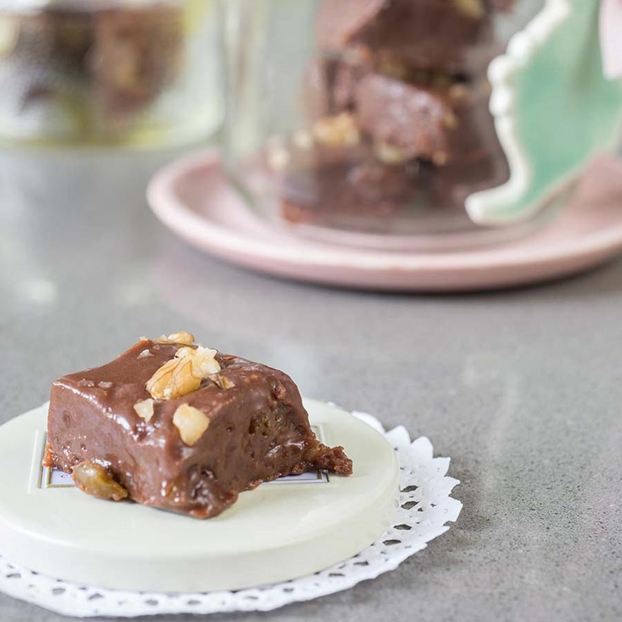 Walnut Fudge With Rum Raisins RecipeIngredients2 cups sugar1 cup milk3 oz. dark chocolate 70% chopped4 tbsp. butter1 tsp. vanilla extract¼ cup chopped nuts¼ cup dark raisins½ cup dark rumDirectionsIn a Mason jar or container with lid, place the raisins and cover with rum. Let them soak for a day.Cover an 8-by-8-inch pan with buttered paper parchment, letting the paper overlap over the edges of the pan (about 2 inches).Place the sugar, milk and chocolate in a medium saucepan over medium heat. Bring to a boil stirring continuously with a wooden spoon until the chocolate is melted and the sugar is dissolved. Don’t stop stirring.Reduce the heat to simmer and continue cooking, without stirring, until the fudge reaches a temperature of about 234° / 238. If you are not using a thermometer, then cook until a drop of this mixture in a cup of cold water forms a soft ball. Feel the ball with your fingers to make sure it is the right consistency. It should flatten when pressed between your fingers.Remove from the heat and add the butter and the vanilla, DO NOT STIR. Cool at room temperature to 110°F (lukewarm) and add the walnuts and raisins. Mix with a spatula or a wooden spoon until it is well blended and opaque.Pour into the prepared pan and let cool completely. Once cooled remove from the pan by lifting the parchment paper – which should easily come out.Cut into squares and store in tightly covered container in a fresh place.This recipe is found in:Recipes by Ingredient: Chocolate RecipesRecipes by Course or Meal: DessertRecipes by Occasion: Thanksgiving Recipes, Holiday Recipes, Valentine's Day RecipesRecipes by Cuisine: American Recipes Recipes by Season: Fall Recipes, Winter Recipes