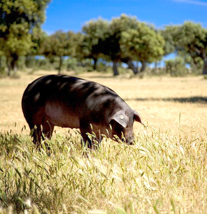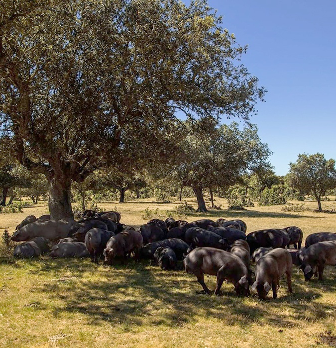Found roaming in idyllic “dehesas” (Spanish for “meadows”), the noble Ibérico pig spends its days feeding on the native wild grass and the acorns that can be found strewn on it.